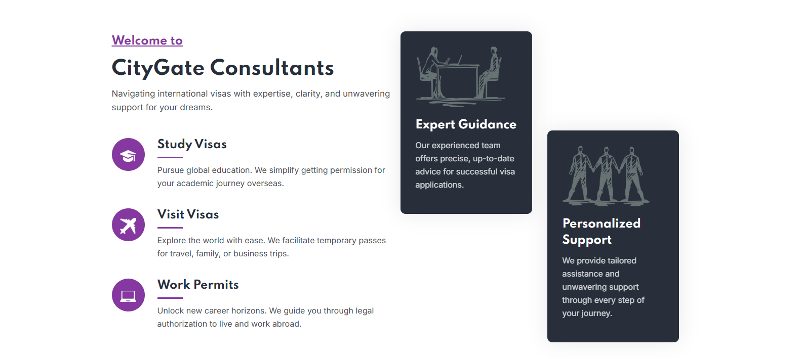 The challenge for CityGate Visa Consultancy was to create an online presence that was both highly informative and incredibly easy to navigate. I crafted a website with a clean, intuitive layout that simplifies the complex visa application process for their clients. The site includes a dedicated resources section, a clear step-by-step guide for applicants, and multiple contact points. The result is a highly efficient digital hub that improves the client experience and allows CityGate Visa Consultancy to manage inquiries more effectively.